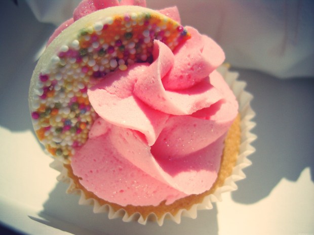 Two salted caramel cupcakes, one vanilla cupcake (the bright pink one! That’s mine!) and a fresh-out-of-the-oven banana and chocolate chip cake slice! I like them even more because they put all these treats into a lovely brown paper bag.