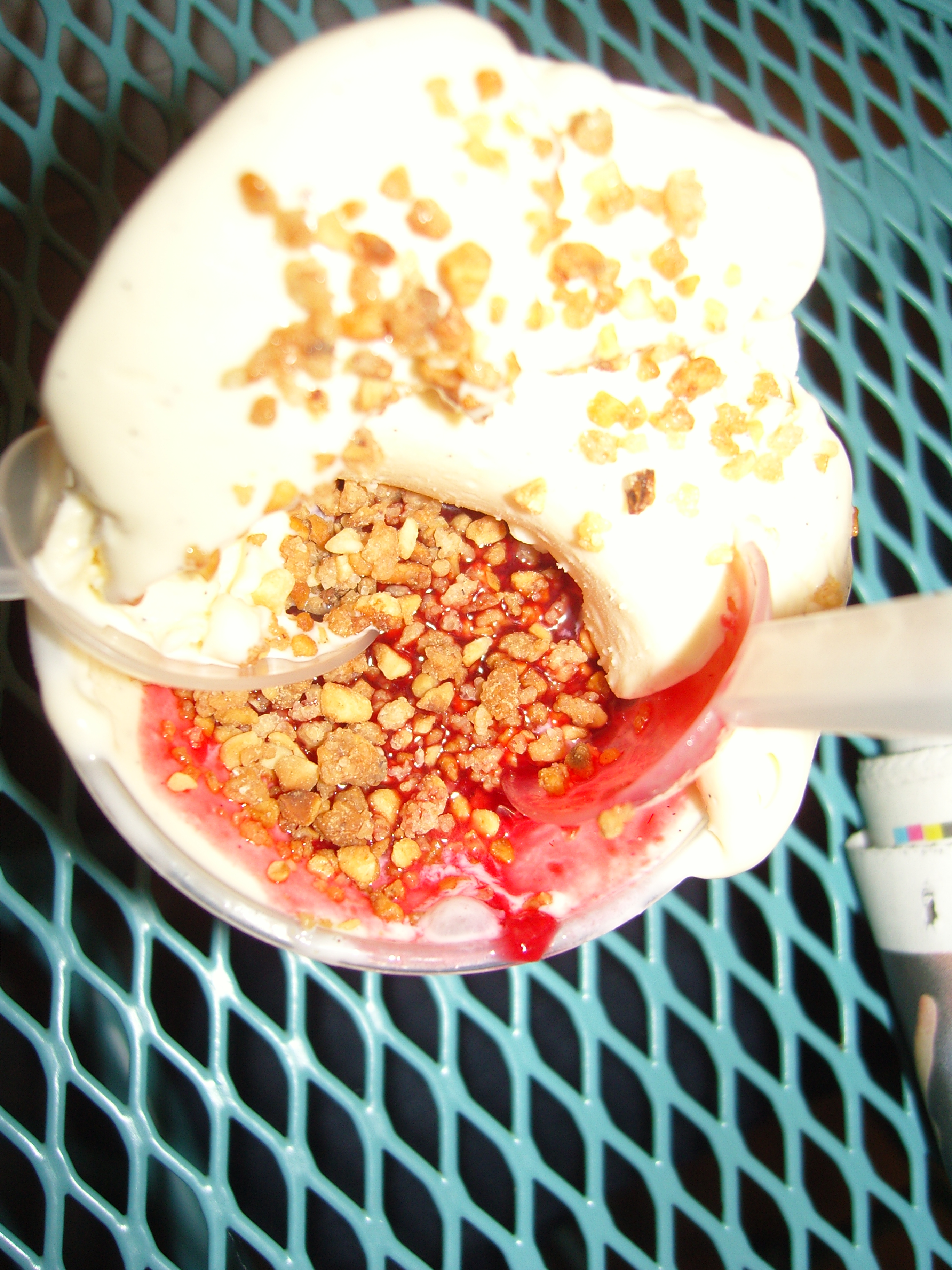 Toppings came in test tubes, and we chose to have crushed hazelnuts and raspberry coulis! They had a few little garden chairs and tables round the corner which weren’t busy so we tucked ourselves in a corner and whole-heartedly enjoyed our ice cream!