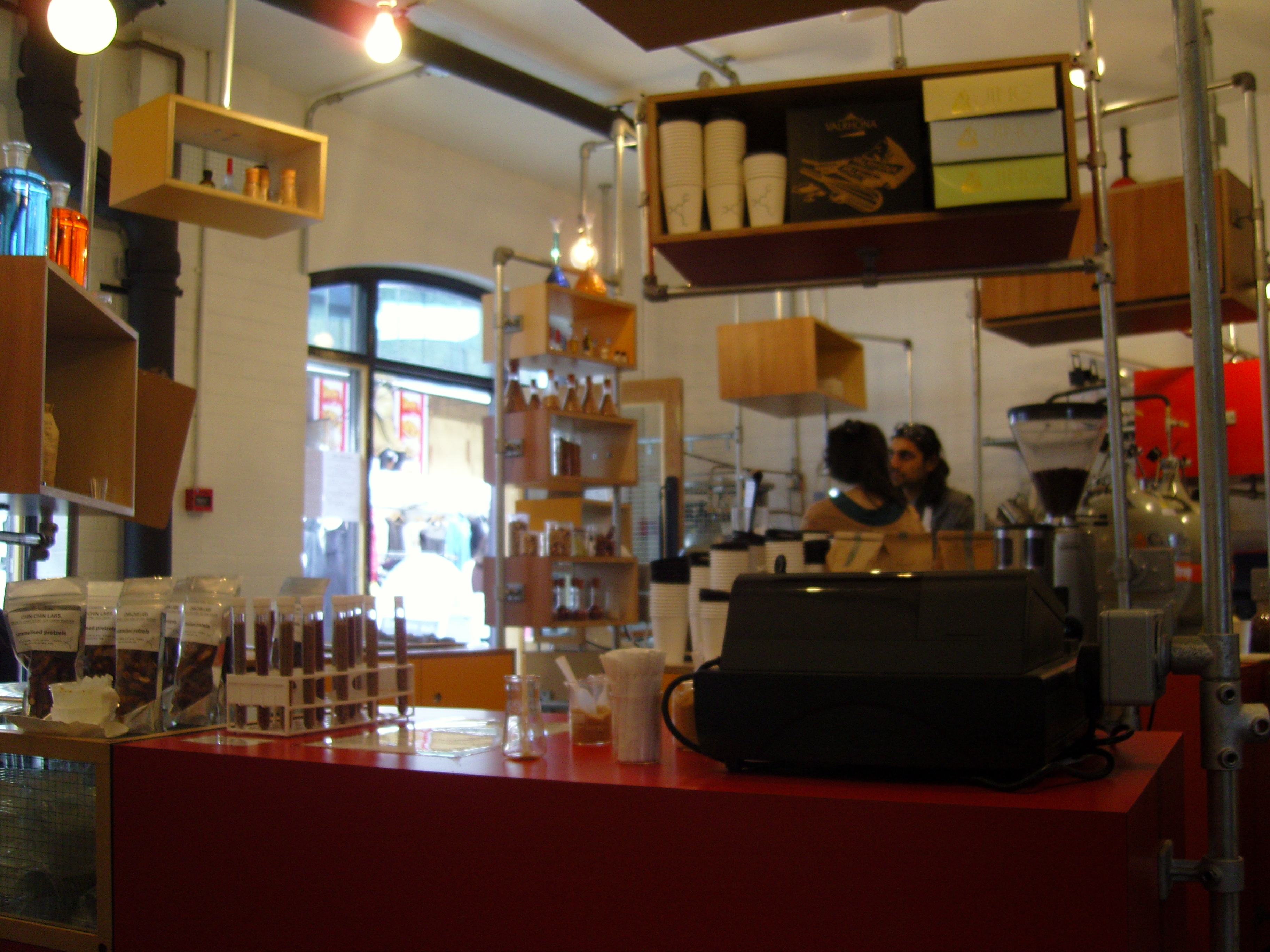 The interior of the parlour resembles a mad scientist’s experimental lab. There are test tubes and glass bottles everywhere, but the whole parlour looks very modern and fresh with the square wooden hangings, the white washed walls and the staff all wearing white lab coats!