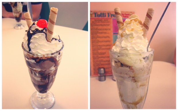 All of Tutti Frutti‘s ice cream sundaes are named after an Elvis Presley song (so my Gran told me!) I got the Jailhouse Rock (chocolate and vanilla ice cream, marshmallows and crushed digestive biscuits), my sister got the Be-Bop-A-Lula (banana and vanilla icecream with real banana pieces and crushed digestive biscuit!) and MrJ got the Honky Tonk (pistachio ice cream, hazelnut ice cream with crushed hazelnuts, peanuts and pistachios)! They all went down a storm, and I certainly would have one again. They were also pretty huge so fitted the £3.95 price tag per sundae.