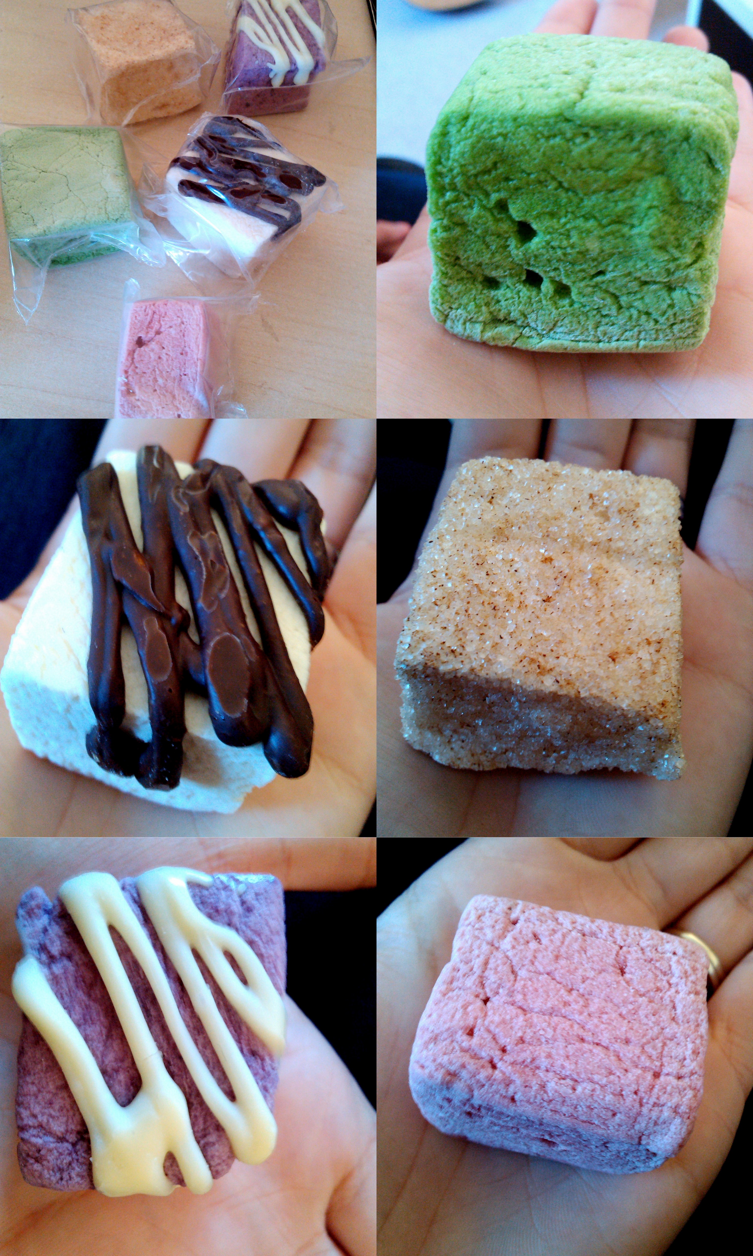 The airtight packaging meant that our marshmallows were perfectly soft and fluffy. Louisa kindly sent us 5 different types of marshmallows to sample which were (from top, left to right): lime punch, dark chocolate peanut butter drizzle, sugar & spice, love currant & white chocolate and raspberry.