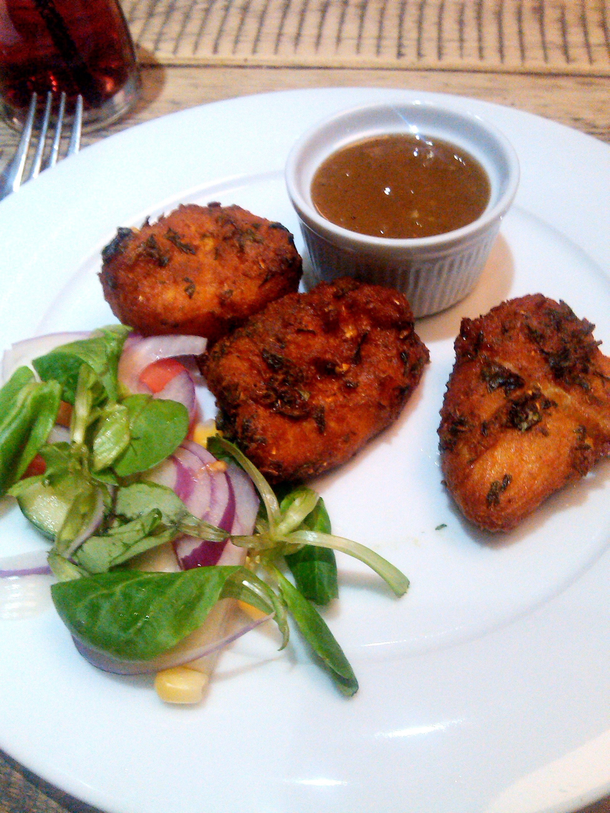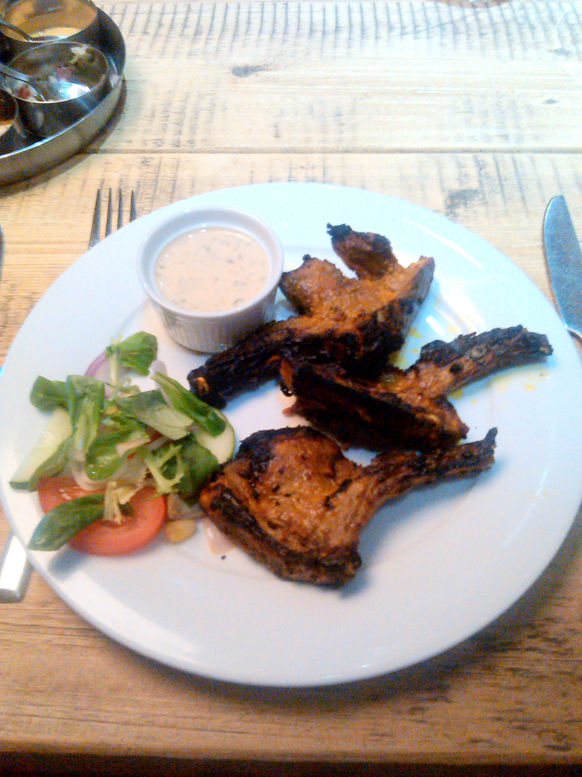 We ordered poppadoms & dip, a blackcurrent & lemonade and a jug of lime juice while we browsed at the menu. I am not really acquainted with Indian/Punjabi cuisine, but I was getting excited looking at all the different options on the menu! I ordered the Lahori Fried Fish (£4.25) for my starter (I’d seen it advertised on their Facebook page and thought it looked delicious!), and MrJ ordered the Grilled Lamb Chops (£3.95).