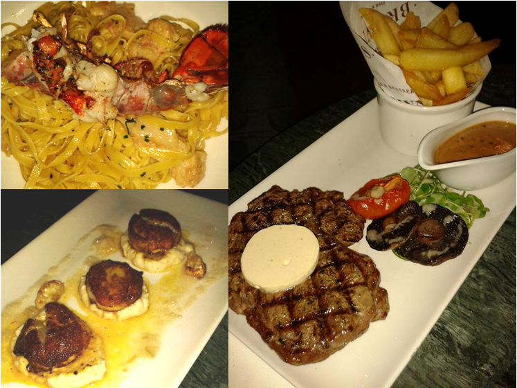 We visited Browns on a Thursday evening which was lobster night.  Unfortunately, at seven o’clock, we were too late and the kitchen had already run out of the lobster special.  We had been looking forward to trying this dish so we were disappointed, but the waiter suggested the lobster tagliatelle from the a la carte menu which was still available.  Served with flaked lobster in a light cream and white wine sauce and topped with half a grilled lobster tail still in its shell, it was delicious and well-cooked and proved to be a wonderful alternative, so they had our complete forgiveness! We also tried the 28-day-aged rib eye steak which was one of the the best steaks we’ve ever had. The steak comes with chunky chips and you can add a choice of sauces.  We opted for the tasty peppercorn sauce, which was mild, thick and creamy.  The portion sizes throughout the night were ample and really satisfying: a good thing when the dishes are so moreish!