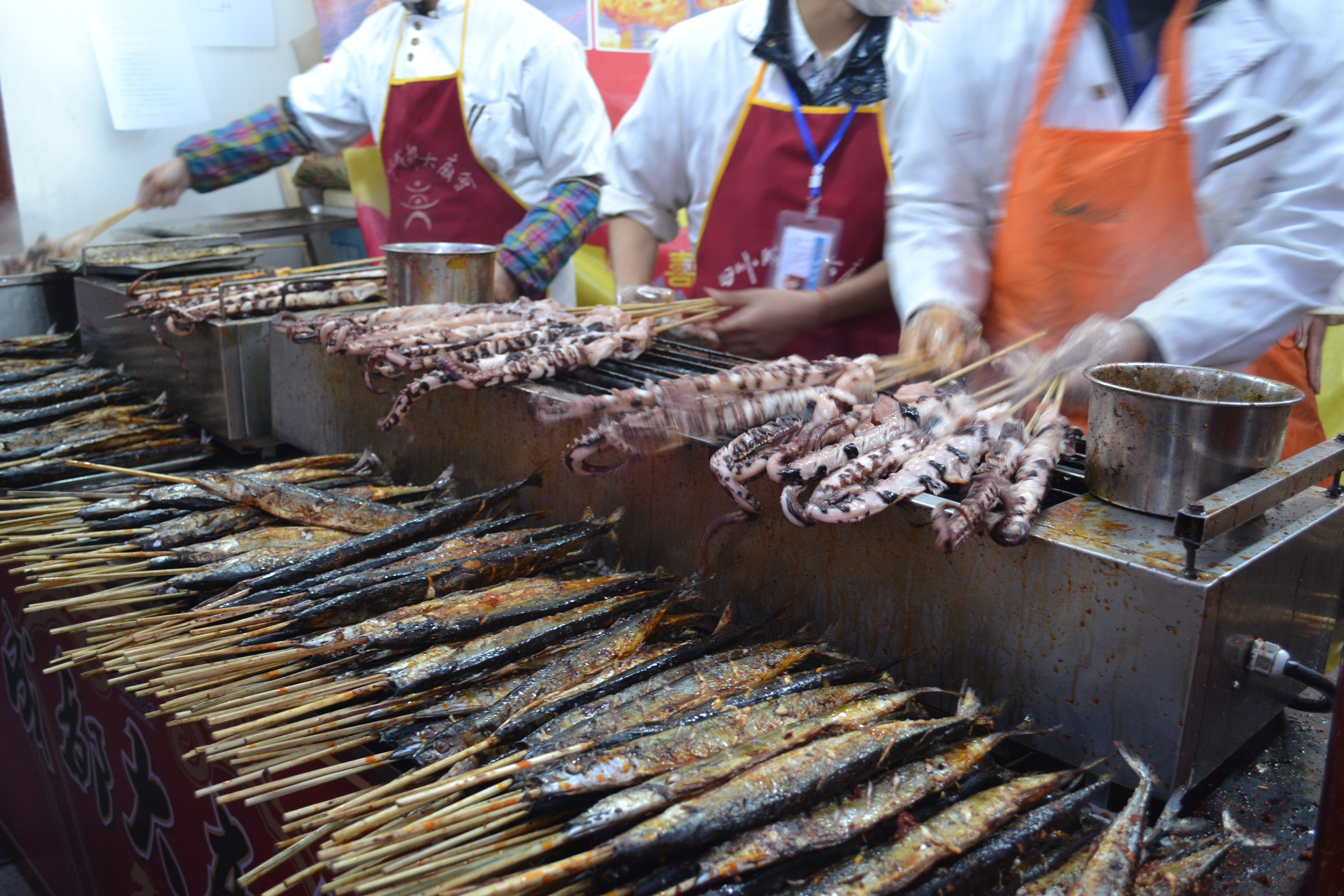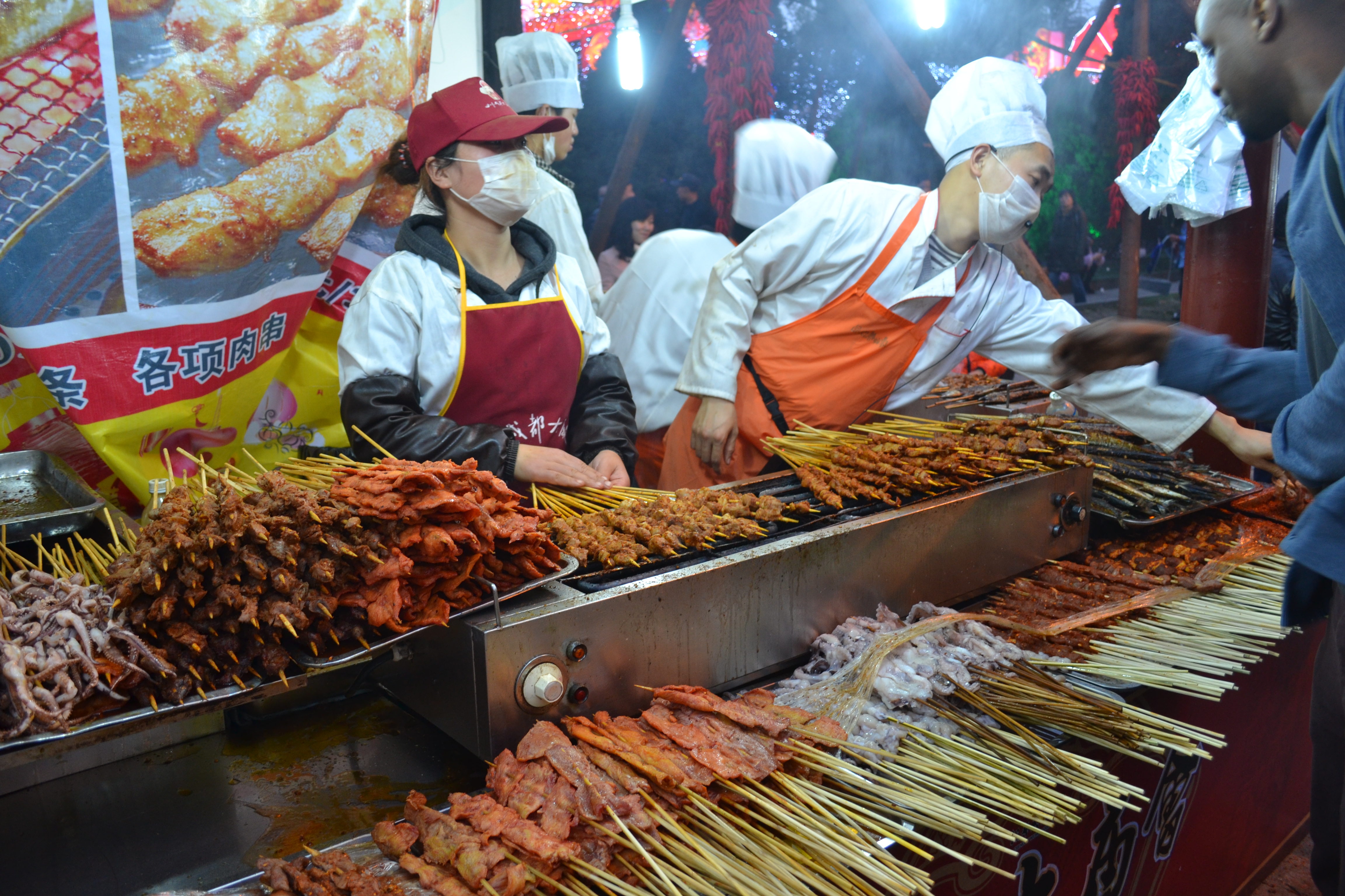 This is a popular chinese snack and can be found as stand-alone restaurants as well as little street food stalls. Basically,  it’s just meat or vegetables skewers that are BBQ’d and grilled in front of you. They usually then brush a spicy seasoning all over them when they’re cooked, since Chengdu people love spice! Anything can be shao-kao-ed. The proof is in the pictures: