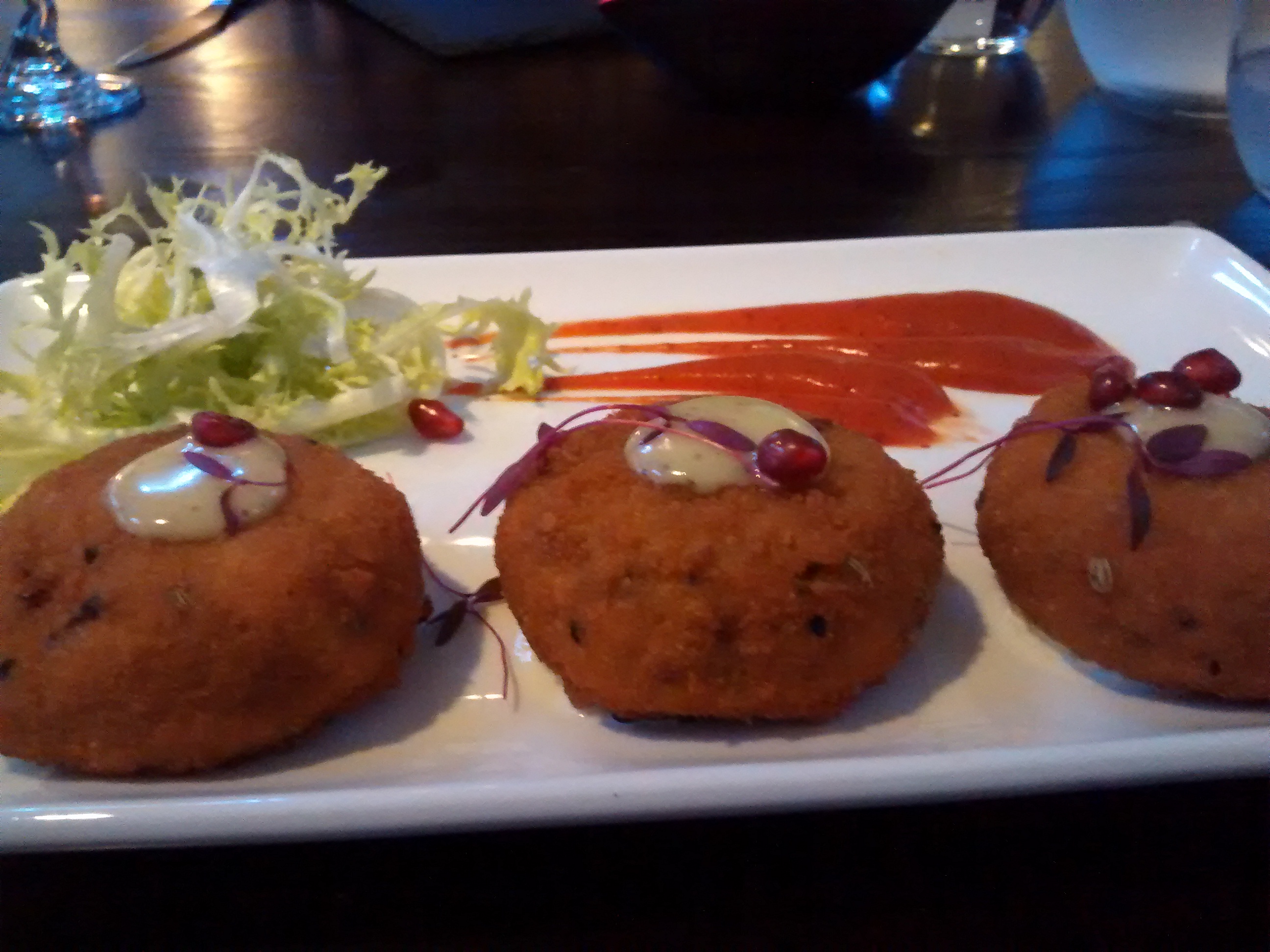 1. The food looks lovely, especially your crab cakes! The rice looks a bit on the greasy side though, but I love sort of sweetish naan too, always a plus on the menu.