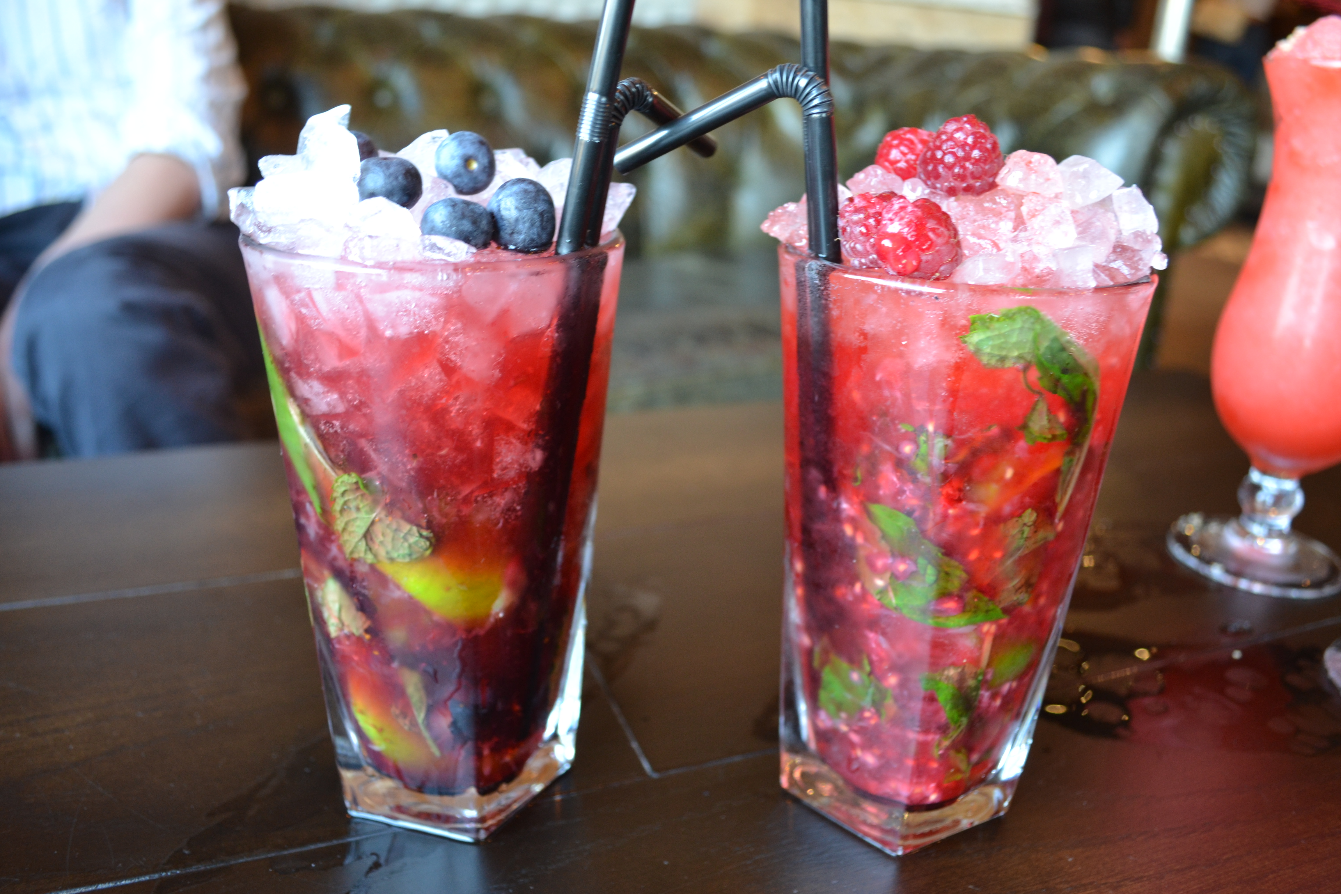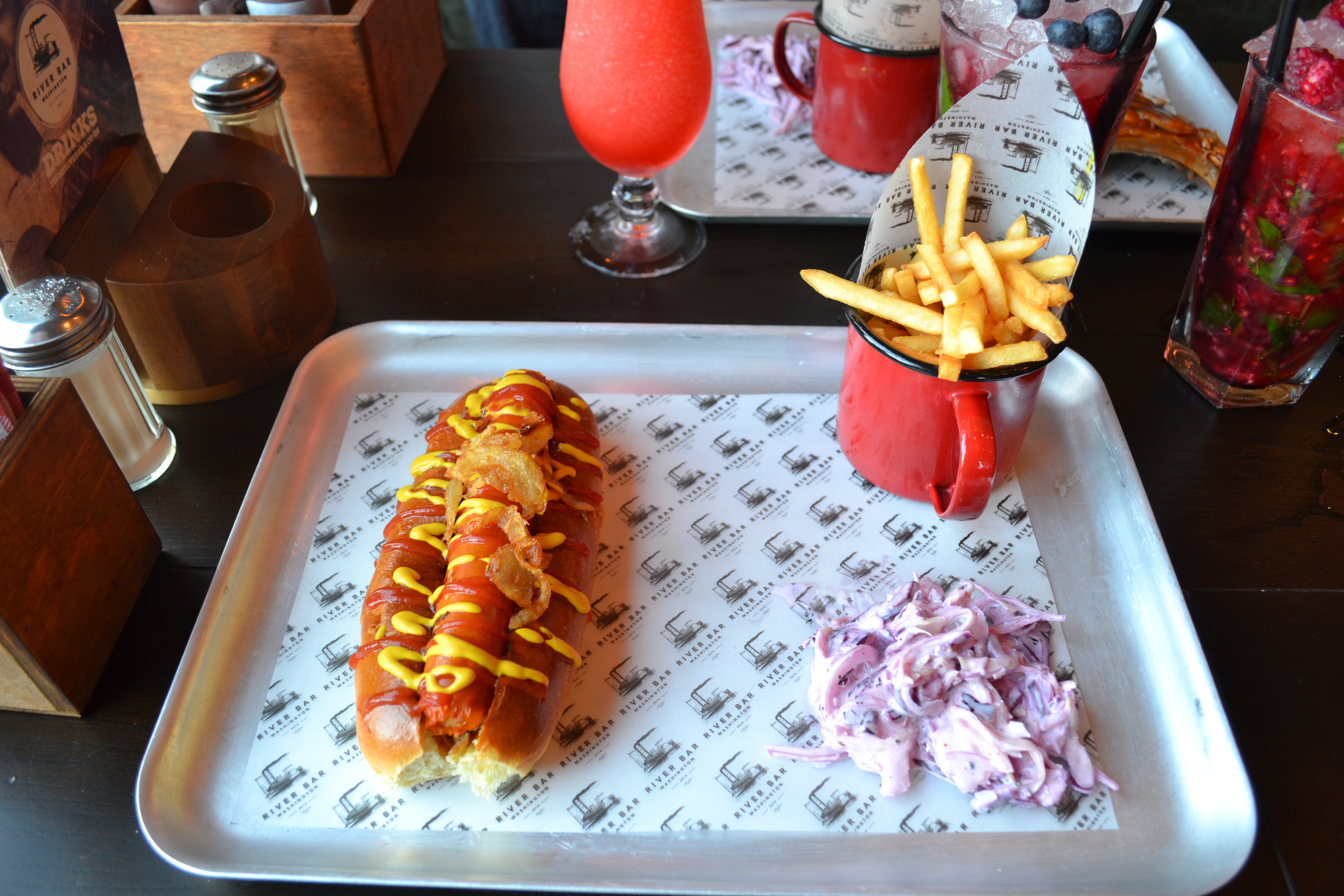 We ordered a mix of mocktails to start – blueberry mojito, raspberry mojito and two bubblegum ‘popping candy’ daiquiris which were very fun. The mojitos were our favourite, and I loved how much fresh fruit was piled on top. As we sipped on our drinks, we looked at the menu. I couldn’t choose between a hot dog, burger or sliders, but John went straight for Half Rack of Hickory Smoked BBQ Ribs, and I (eventually) chose the River Dog.