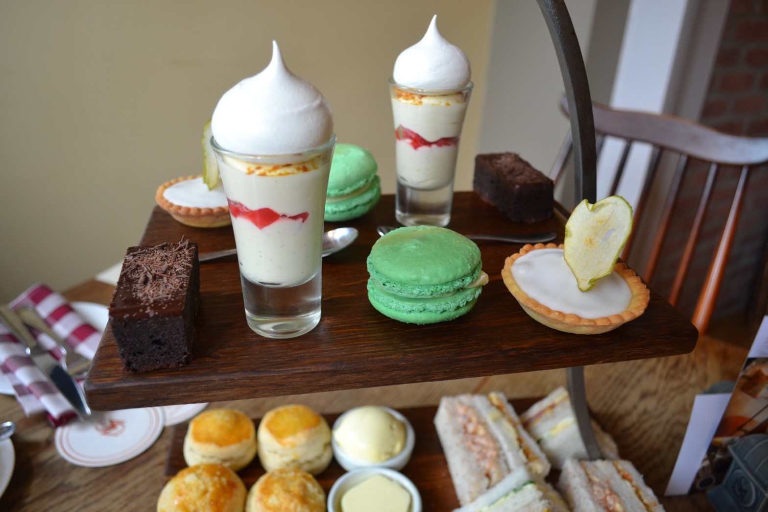 We didn’t have to wait long for our afternoon tea to arrive, and it looked so beautiful when it did. It was displayed on a wooden two-tier stand which I thought was quite modern, and in-keeping with the theme of the inn.