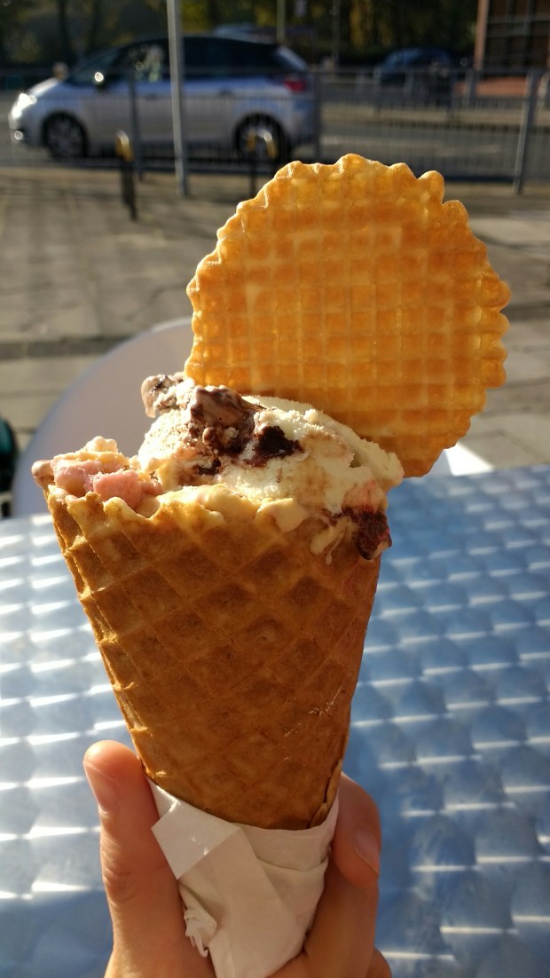 I ordered a two scoop ice cream cone (£3)(which comes in a sugar cone) of pumpkin spice ice cream and kinder bueno ice cream. Now, I’m the first to admit that that flavour combination didn’t go together! But each one was delicious! You can get complimentary toppings like sprinkles, chocolate flakes etc.