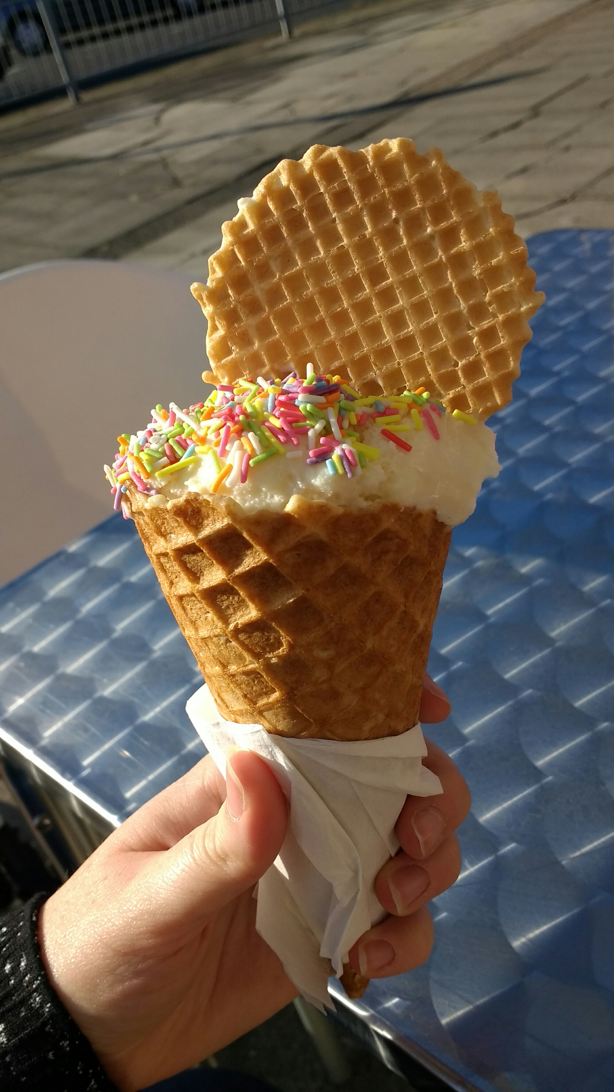 I ordered a two scoop ice cream cone (£3)(which comes in a sugar cone) of pumpkin spice ice cream and kinder bueno ice cream. Now, I’m the first to admit that that flavour combination didn’t go together! But each one was delicious! You can get complimentary toppings like sprinkles, chocolate flakes etc.